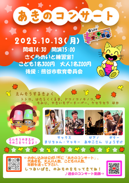 親子で楽しむ♪あきのコンサート 熊谷【0歳からOK】 サックス・ギター・ピアノの生演奏で、秋にぴったりな童謡やアニ…