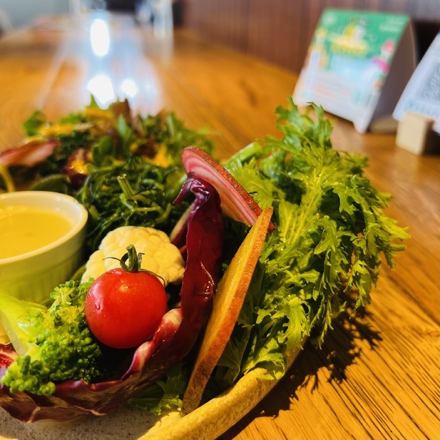 パスタプレート(1380円)は、サラダ・バーニャカウダ・パスタがワンプレートになっていて、野菜がたっぷり! ケールやおかひじきなど珍しい野菜も入っていて新鮮でした。 特にバーニャカウダソースは濃厚で絶品。 ピリ辛のペペロンチーノも食べ進めるうちにクセになる美味しさでした。 店内は落ち着いた雰囲気で、おひとりランチにもぴったり。野菜をしっかり食べたいときにおすすめのお店です。