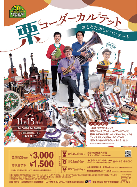 | ご注意事項 | 全席指定(税込)3,000円 高校生以下:1,500円 ※4歳から入場可。 ※高校生以下チケット入場時、本人確認書類を提示 ●8/14(木)10時~熊谷市文化振興財団チケットwebで販売 ●8/22(金)10時~電話予約(048-532-9090)で販売 ●8/22(金)10時~大里生涯学習センターあすねっとで販売 ●8/22(金)10時~さくらめいとチケットカウンターで販売 |