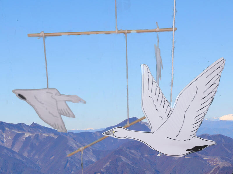 冬に群れでやってくるハクチョウについて楽しく学んだあと、風でゆらゆら揺れるハクチョウのモビールを作ります。