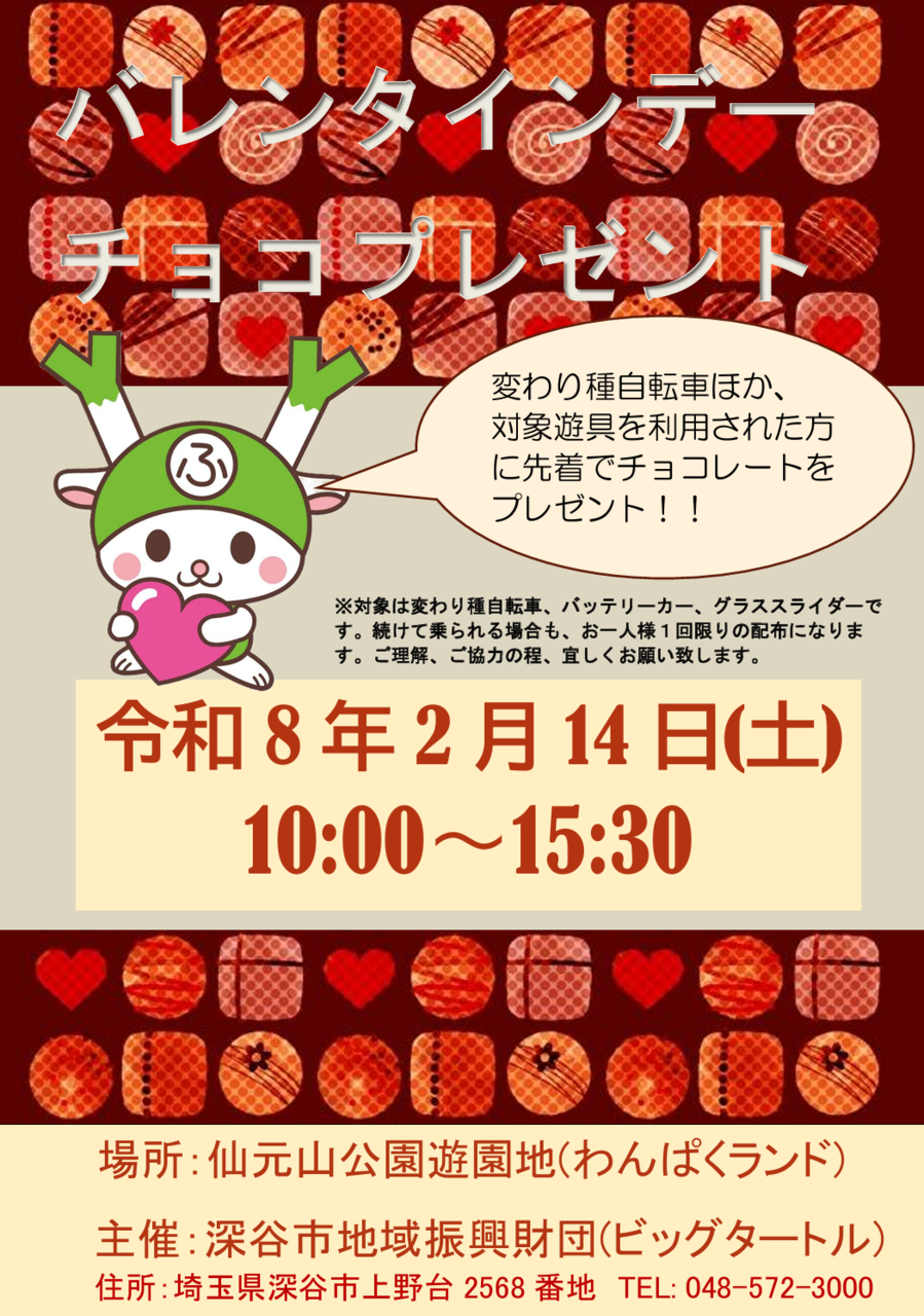 バレンタインデーにちなんで対象の遊具(変わり種自転車、バッテリーカー、グラススライダー)ご利用の方に先着でチョコレートをプレゼント!!