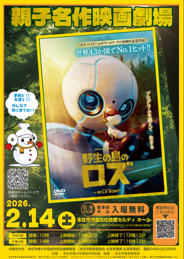 本庄市青少年育成市民会議では、親子での楽しいひとときを提供し、そこからコミュニケーションが広がりよりよい親子関係を築く一助となることを願い、親子名作映画劇場を開催します。