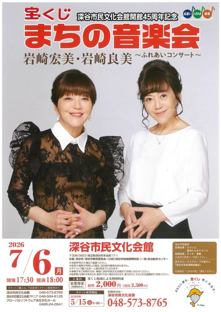深谷市民文化会館開館45周年記念 宝くじ まちの音楽会 岩崎宏美・岩崎良美~ふれあいコンサート