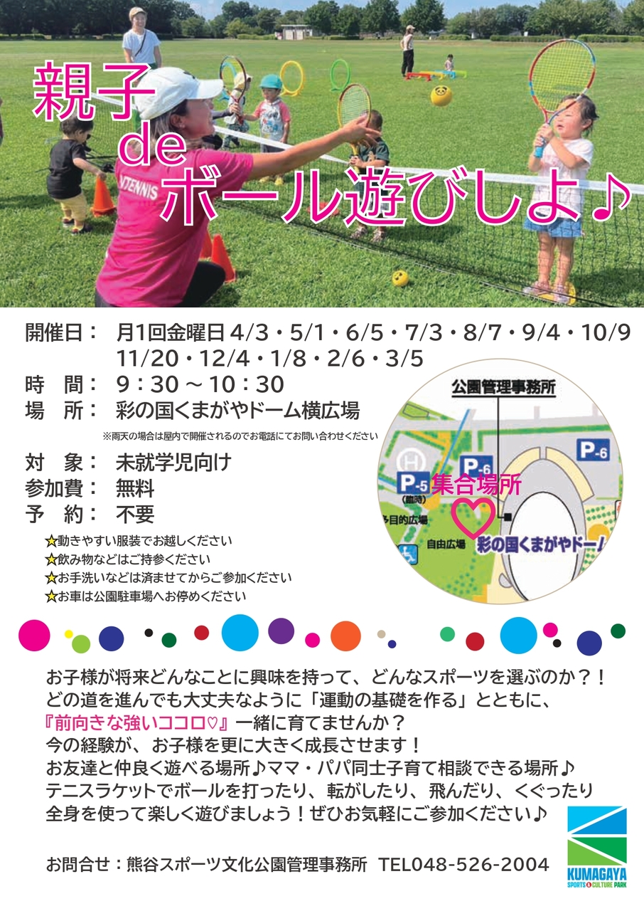 | ご注意事項 | ★動きやすい服装でお越しください ★飲み物などはご持参ください ★お手洗いなどは済ませてからご参加ください ★お車は公園駐車場へお停めください |