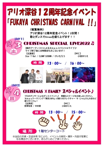 アリオ深谷12周年記念イベント! 2日間!! 歌とダンスでXmasを盛り上げます!! 【12/3(土)】 CH…