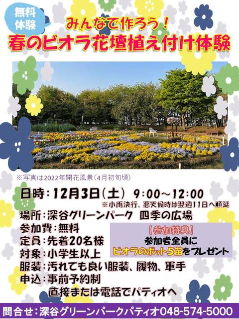 無料体験!みんなで作ろう春のビオラ花壇植え付け体験! 定員:先着20名 対象:小学生以上 服装:汚れても良い服装、履…