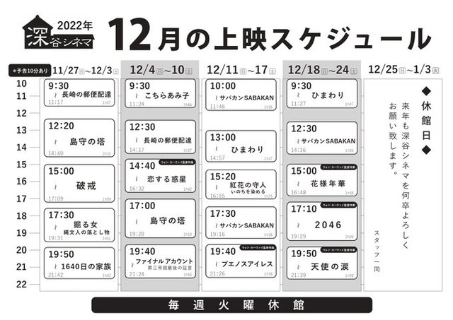 深谷シネマ @fukaya_cinema · 11月25日 ⛄️12月 こちらあみ子 長崎の郵便配達 島守の塔 ファ…