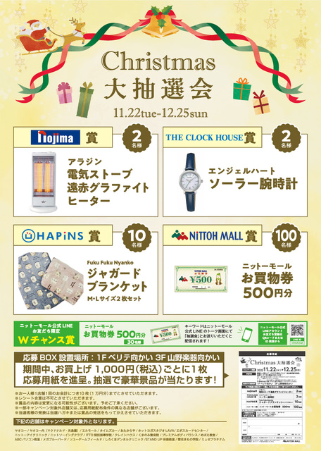 ニットーモール クリスマス大抽選会 期間中、お買上げ1,000円(税込)ごとに1枚応募用紙を進呈。 抽選で豪華景品が…