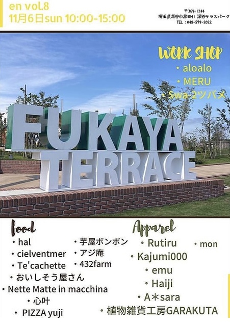 深谷テラスパーク円形公園にて「en 小さなお店で彩りを vol.8」を開催します。 今回もたくさんの出店者さんに参加し…