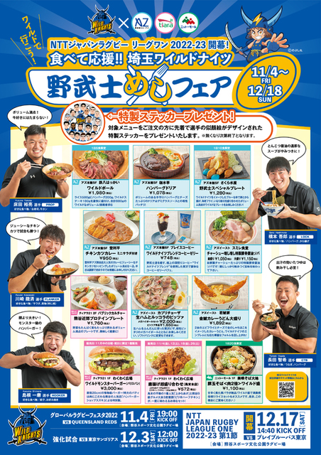 食べて応援!野武士めしフェア! 埼玉ワイルドナイツ×駅前3館 各ショップこだわりの「野武士めし」を食べて、埼玉ワイル…