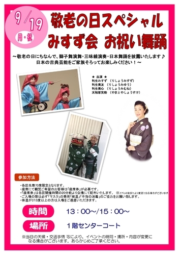 〜敬老の日にちなんで、獅子舞演舞・三味線演奏・日本舞踊を披露いたします。 日本の古典芸能をご家族そろってお楽しみくだ…