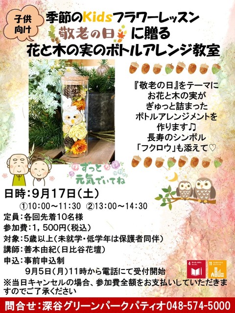 【事前申込制】季節のKidsフラワーレッスン「敬老の日に贈る花と木の実のボトルアレンジ教室」