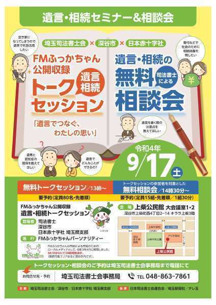 この度、埼玉司法書士会、日本赤十字社埼玉県支部、深谷市の共催による無料相続・遺言セミナーをトークセッション形式で開催い…