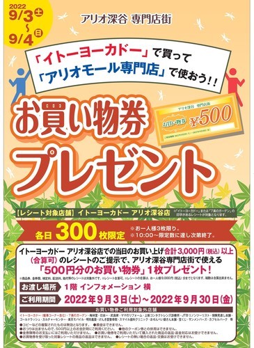 ●配布期間:9/3(土)~9/4(日) ※限定数 各日300枚、期間合計:600枚 ●ご利用期間:2022年9月3…