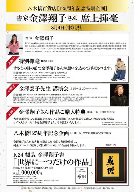 八木橋125周年記念 書家 金澤翔子さん席上揮毫 『大黄金展』特別企画として8月4日(木)1日限り 書家金澤翔子さん…