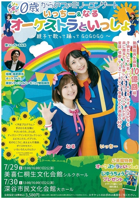 子供たちに大人気「いっちー&なる」がオーケストラと共に贈るとっても楽しいファミリーコンサートです。童謡・唱歌・ディズニ…