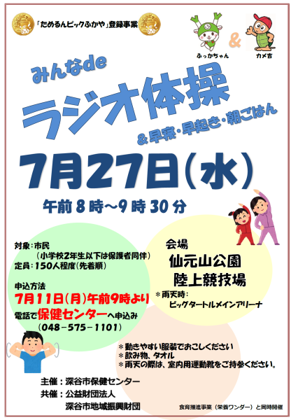 「みんなdeラジオ体操&早寝・早起き・朝ごはん」を開催します。早朝から体を動かして、 暑さに負けない体づくりを行いませ…