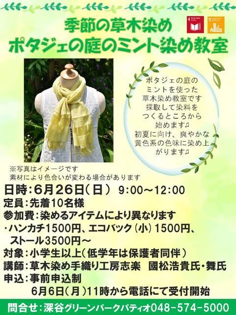 ポタジェの庭のミントを使った草木染め教室です。採取して染料を作るところから始めます。 初夏に向け、爽やかな黄色系の色味…