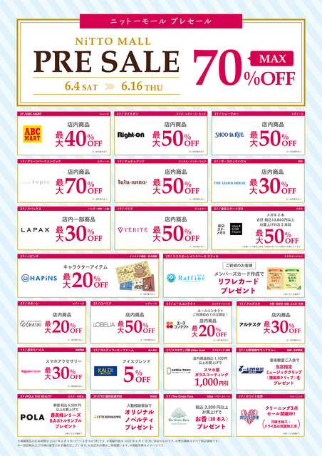 ニットーモール プレセール MAX 70%OFF ■期間:2022年6月4日(土)~6月16日(木) ■場所:ニット…