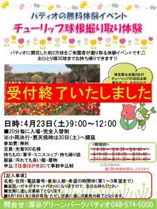 毎年恒例!チューリップの球根の掘り取り体験を今年も開催いたします! 『往復はがき』による事前申込制となっております。 …