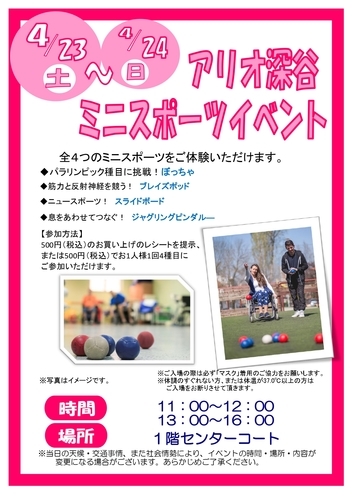 全4つのミニスポーツをご体験いただけます。 ◆パラリンピック種目に挑戦!・・ぼっちゃ ◆筋力と反射神経を競う!・・ブ…