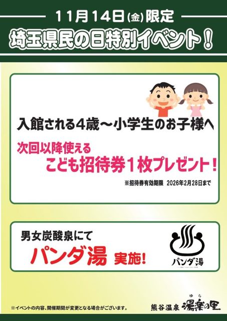 小学生以下(4才以上)の お子様に「次回使えるこども招待券」をプレゼント! その他に替り湯などのイベントも実施します。…