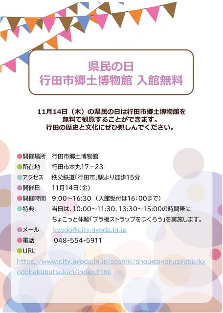 11月14日(木)の県民の日は行田市郷土博物館を無料で観覧することができます。 行田の歴史と文化にぜひ親しんでください…