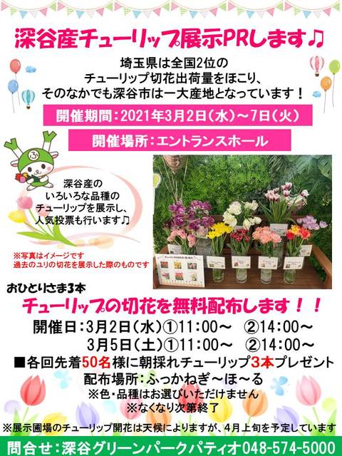 3月2日(水)から7日(月)まで、パティオエントランスホールにて深谷産のチューリップの切花の展示PRを実施いたします!…