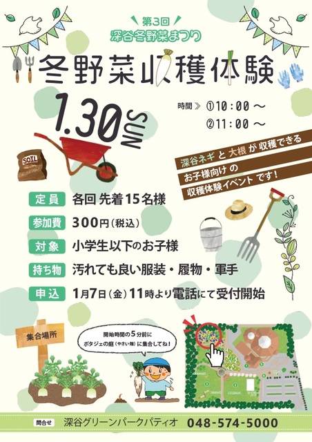 第3回深谷冬野菜まつり「冬野菜収穫体験」を開催します! 深谷ねぎと大根が収穫できるお子様向けの収穫体験イベントです。 …