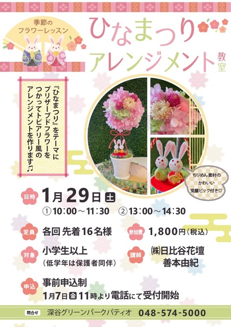季節のフラワーレッスン「ひなまつりアレンジメント教室」を開催します! 「ひなまつり」をテーマにプリザーブドフラワーを使…