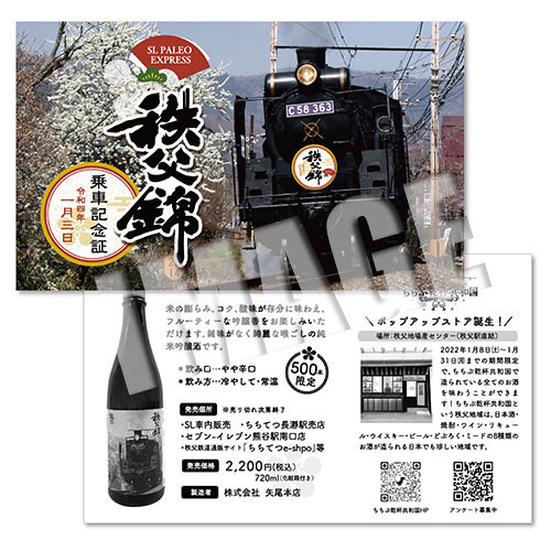 矢尾本店の協力のもと、秩父地域の銘酒「秩父錦」をSLパレオエクスプレス車内で楽しめる「SL秩父錦号」を運行いたします。…