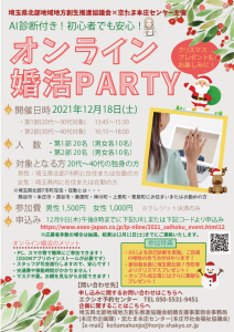 婚活を希望している独身の男女に出会いの場を提供するオンライン婚活を開催します。 事前にAIを活用した自己診断を実施!よ…