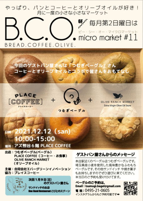 B.C.O.micro-market #11《 つむぎベーグル 》 パンとコーヒーとオリーブオイルの小さくも魅力的な…