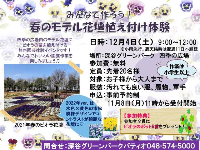 四季の広場内のモデル花壇にビオラの苗を植え付ける無料園芸体験イベントです。 みんなでワイワイ園芸作業を楽しみましょう!