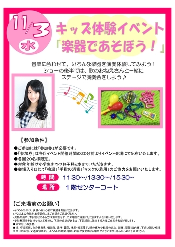 音楽に合わせて、いろんな楽器を演奏体験してみよう! ショーの後半では、歌のおねえさんと一緒にステージで演奏会をしよう♪…
