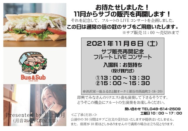 お待たせいたしました!11月からサブの販売を再開します!それを記念して、フルートのLIVEコンサートを企画しました。こ…