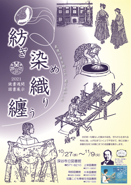 2021年読書週間展示 渋沢栄一も関与した製糸や染色、それから生まれる布地と服。人が生きていく上で不可欠で、時には強…
