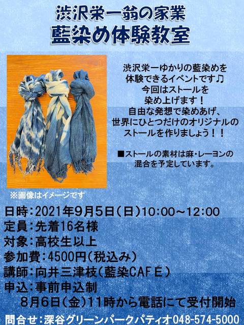 渋沢栄一ゆかりの藍染を体験できるイベントです。今回はストールを染め上げます。 自由な発想で染め上げ、世界にひとつだけの…