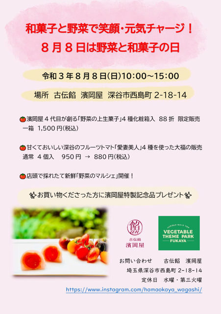 創業130年の古伝餡 濱岡屋が野菜を使った和菓子を作ります。 8月8日は和菓子と野菜で笑顔、元気をチャージしましょう。…