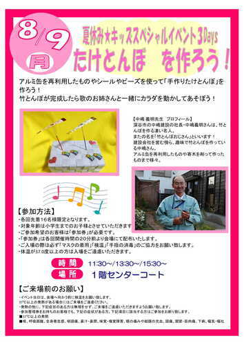 アルミ缶を再利用したものやシールやビーズを使って「手作りたけとんぼ」を作ろう! 竹とんぼが完成したら歌のお姉さんと一緒…