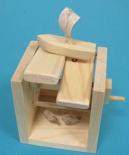 かわはくの日本一の大水車と同じ、埼玉県産の木材を使用して、ハンドルを回すと舟が動く木のおもちゃを作ります。 船の下を覗…
