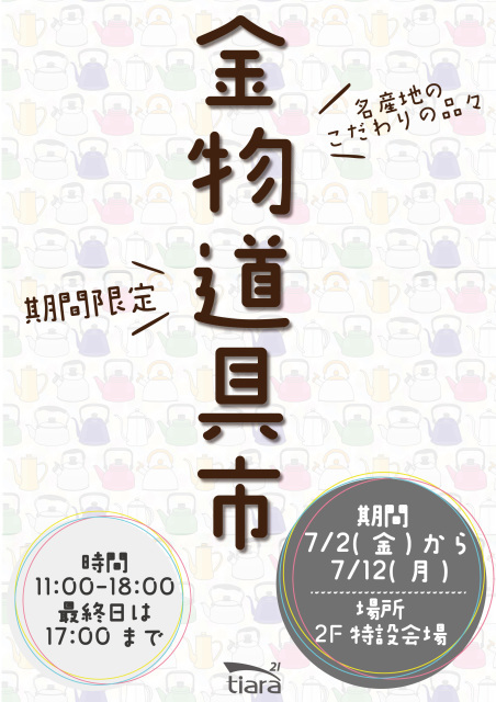 金物道具市・思い出横丁 下記日程で金物道具市・思い出横丁を開催! ティアラ21にて名産品のこだわりの品々やうれしなつ…