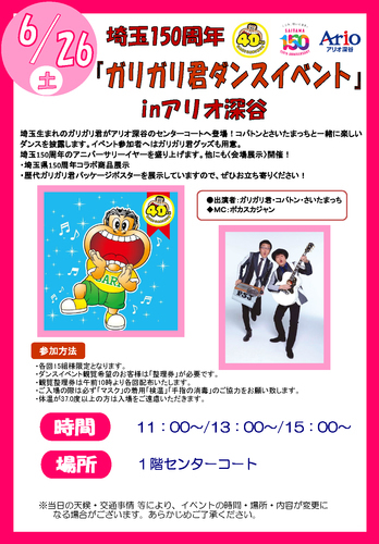 埼玉生まれのガリガリ君がアリオ深谷店のセンターコートへ登場! コバトンとさいたまっちと一緒に楽しいダンスを披露します。…