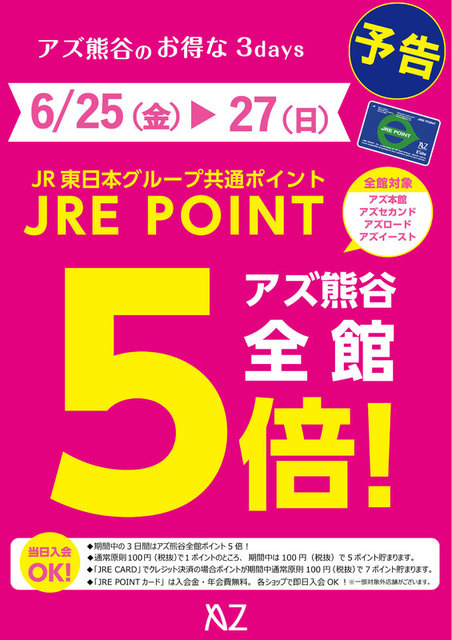 アズ熊谷全館JRE POINT5倍 ★全館JREPOINT5倍★ アズ熊谷全館でのお買物やご飲食がお得になるJRE…