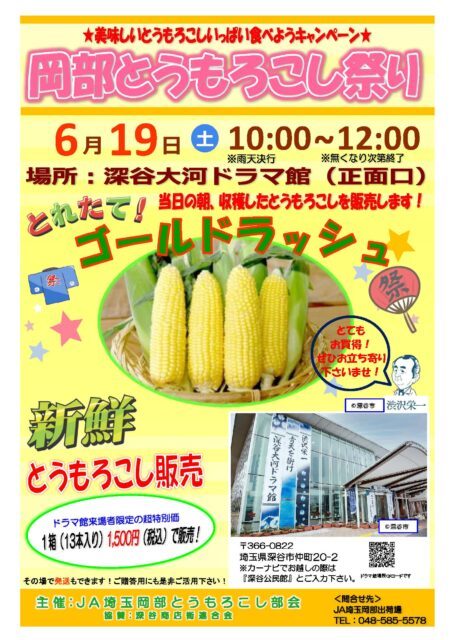 「渋沢栄一 青天を衝け 深谷大河ドラマ館」前で旬の朝採れとうもろこしを特別販売します(イベント来場者限定のお得な価格に…