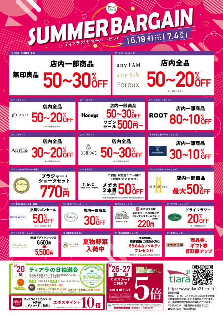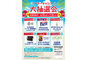 サマーチャンス大抽選会 期間中、お買上げ1,000円(税込)ごとに1枚応募用紙を進呈。 抽選で豪華景品が当たります!…