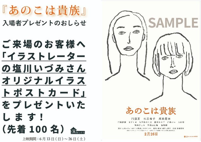 『あのこは貴族』ご鑑賞のお客様にイラストレーター塩川いづみさんが描き下ろしたイラストを使用したポストカードをプレゼント…