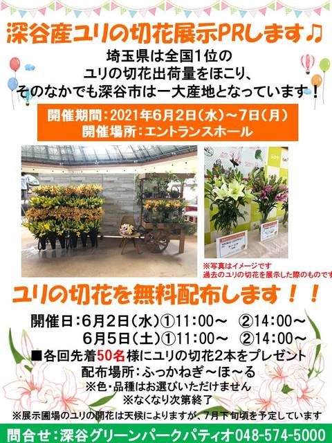 深谷産ユリの切花展示PRします! 埼玉県は全国1位のユリの出荷量をほこり、その中でも深谷市は一大産地となっています。 …