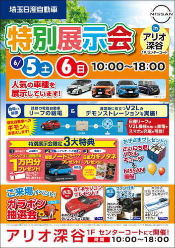 人気の車種を展示します!! 会場にて、話題の電気自動車リーフの給電&V2Lのデモンストレーションを実施! その他に特別…