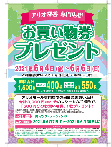 ●内容:アリオモール専門店で期間中のお買上げ合計3,000円(税込)分のレシートのご提示で、「500円分のお買物券」1…